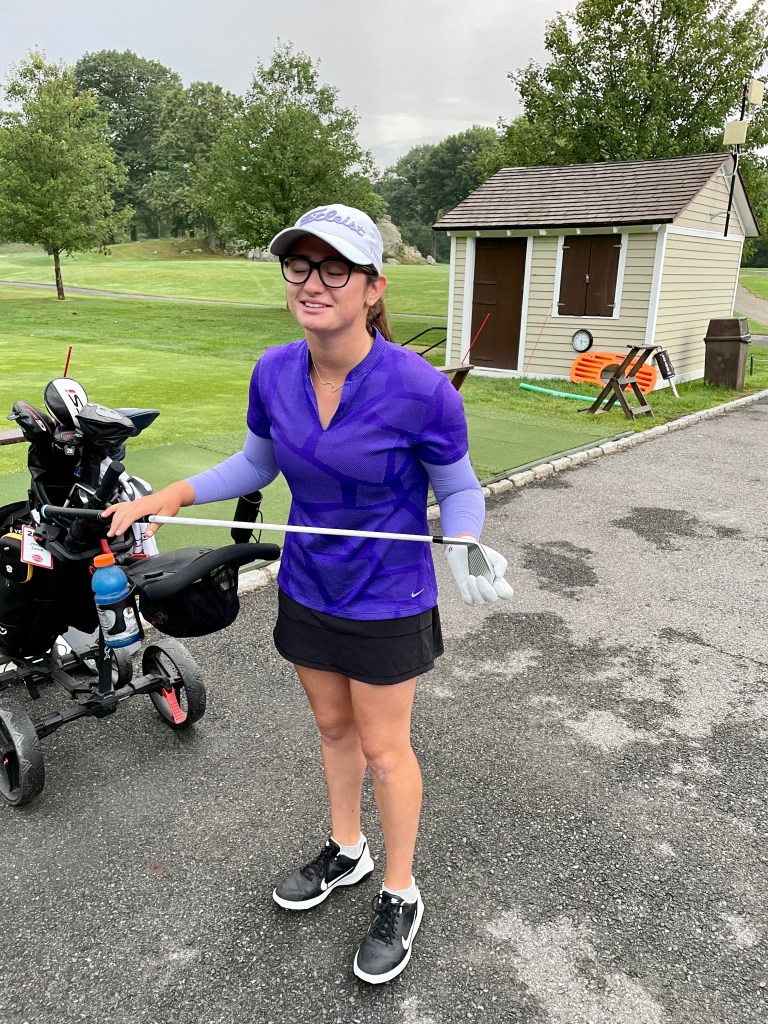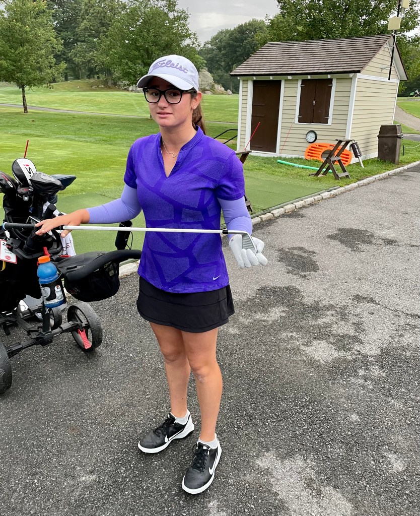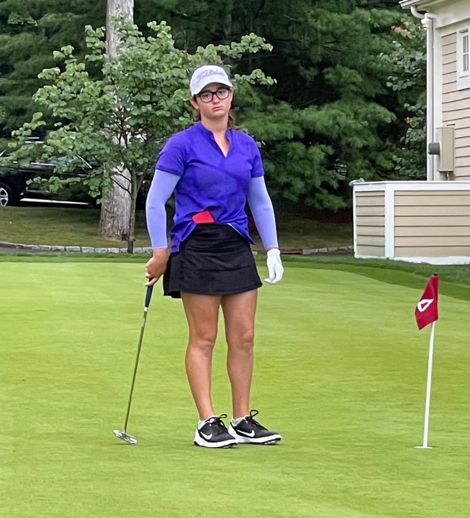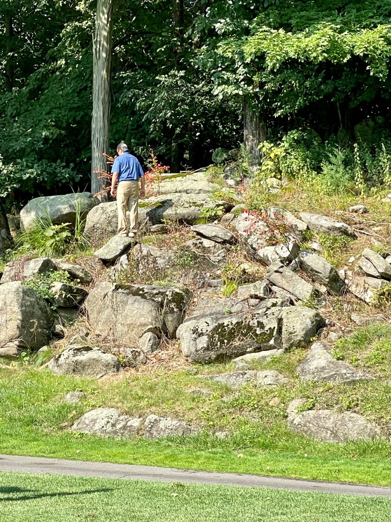 Tournament came to close today after a long and hot week at Burning Tree. Front nine saw B finish with a one over par 37 including two birdies. The back was more complicated. Jordan parred 10, then lost her ball on 11. Drive flew toward an outcropping of rock and ricocheted god knows where. Despite everyone’s best efforts that beautiful white ball with 33 and a purple dinosaur on it chose to hide. Jerry who came to watch even scaled the wall in his efforts without success. Jordan had to re-T the ball and sunk it in 5 shots which would have been par but she had to add on 2 strokes for the original lost ball and ended up with a double bogey. She tried to shake it off for the next two holes but bogeyed both with 3 putts. Meanwhile, Sophie in her group got a hole in one on 12 which is always fun to see though we would have enjoyed it much more had it come off of Jordans drive of course.