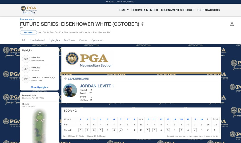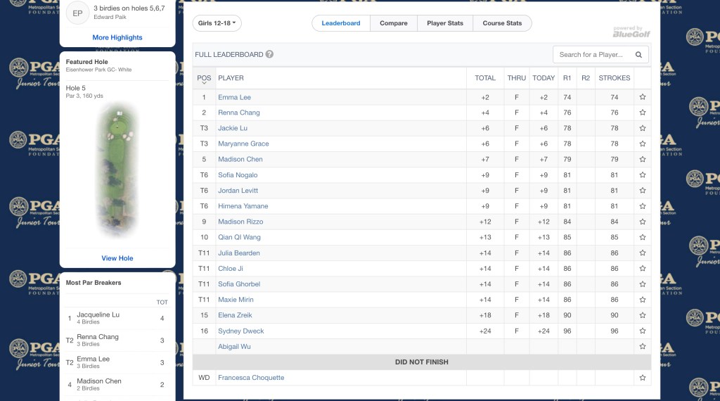 Tomorrow is another day and Jordan still has room to move way up the leaderboard. She will meet with Jerry at 9 tomorrow morning to work through the fix that Carl prescribed for the driver problem (he knew exactly what was wrong of course) and get to Eisenhower by noon for her 1pm T time. Thats all for now. Many thanks once again for all of the texts, emails, and comments.