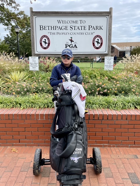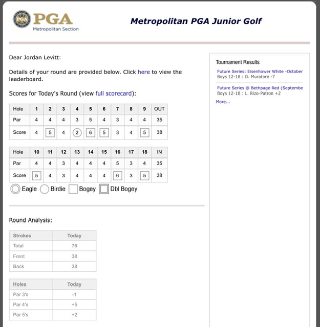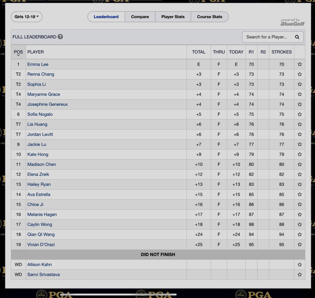 Going into day 2 B is just two strokes out of third place, three out of second and 6 strokes off the lead. In the round she had one birdie, 10 pars and 7 bogeys. The birdie was carded on the 4th hole, a par three with a chip in from four feet off of the green. Putting was good, but not great with 2 three putts. Jordan had no double bogeys at all. She hit 16 fairways in regulation. Overall, a great first showing. T time tomorrow is at 11:30.