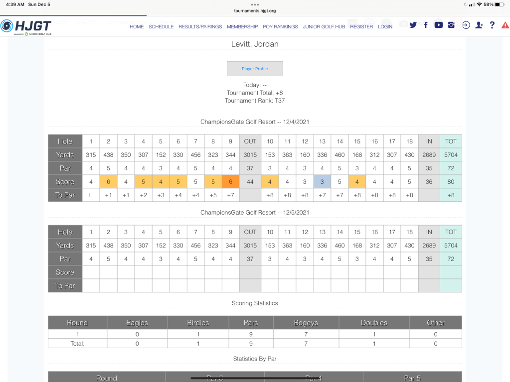 The B had a tough front shooting 7 over through 9 holes with 2 coming from a double bogey on 9 where she put one in the drink. Putting was the biggest weakness of the day where according to Carl at least 6 putts that were within 2 feet missed their mark. The back 9 on the other hand was great. Jordan went only plus 1 on the back including a birdie. Overall, 1 double, 7 bogeys, 9 pars and 1🐥. Jordan’s comment to Mom after the round, ”Can I just go play the front 9 again now? I know what I was doing wrong.” Judging by how she played the back 9, she is probably right. Interestingly enough, the back 9 at Championsgate National Course is much more difficult then the front according to Sarah Zheng.