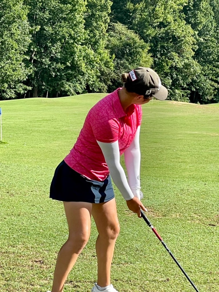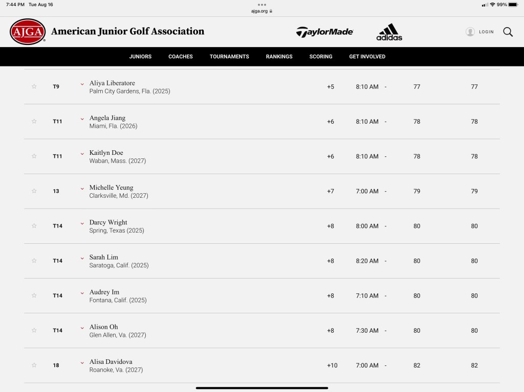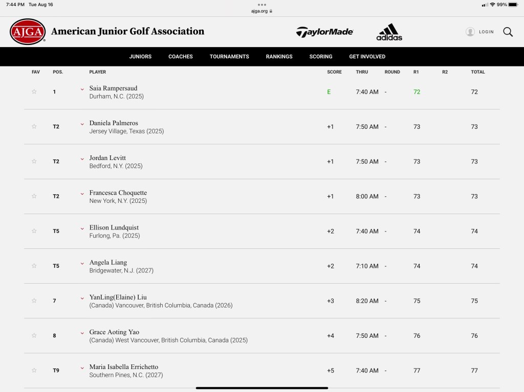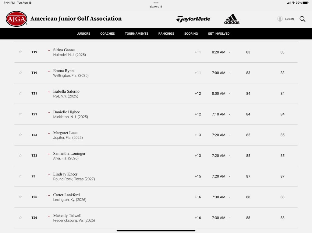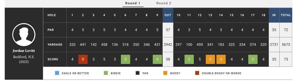 Let’s go hole by hole. 1 was a par 4 that she parred. Two was a disaster. After a short drive, Jordan did not get enough loft on her second shot and hit it into the fescue, her first lost ball in a very long time. The hole turned into a triple bogey. Jordan was plus 3 after only 2 holes and in a deep trouble. Incredibly, she would shake it off and fight. She went par 3,4,5, 🐥6, par 7 & 8 and 🐥9. She went into the back plus 1. She would par 10, then 🐥11 bringing her to even after 11. 12 was a par. 13 & 14 back to back bogeys, both of them 3 putts, putting her at plus 2. 15 & 16 were pars. 17 was what Julie described as the best 🐥 of her life. Putt was from 25 feet, two hills, and 2 breaks to sink for the 4th 🐥 of the day. 18 was a par and that is how she finished at +1 and a tie for 2nd place after day one of three.