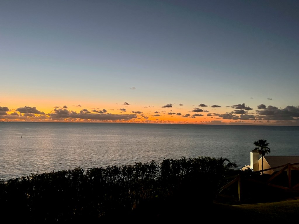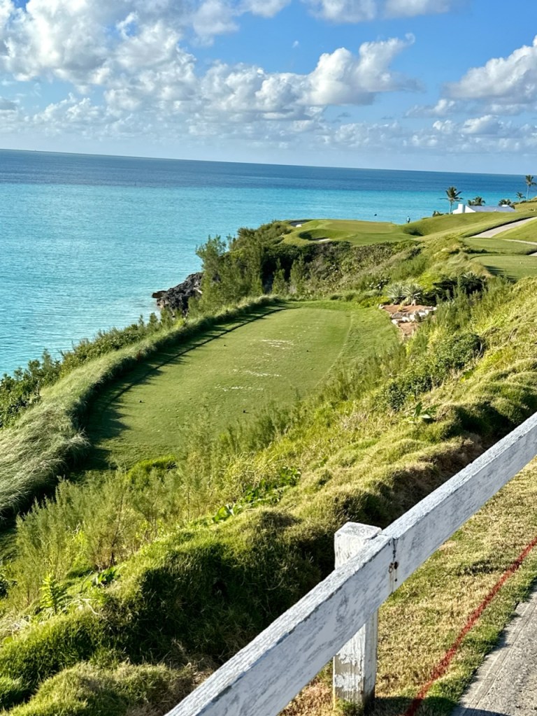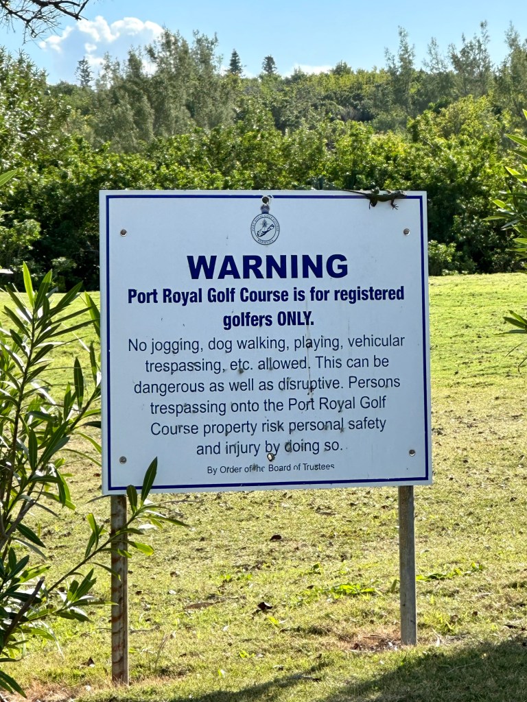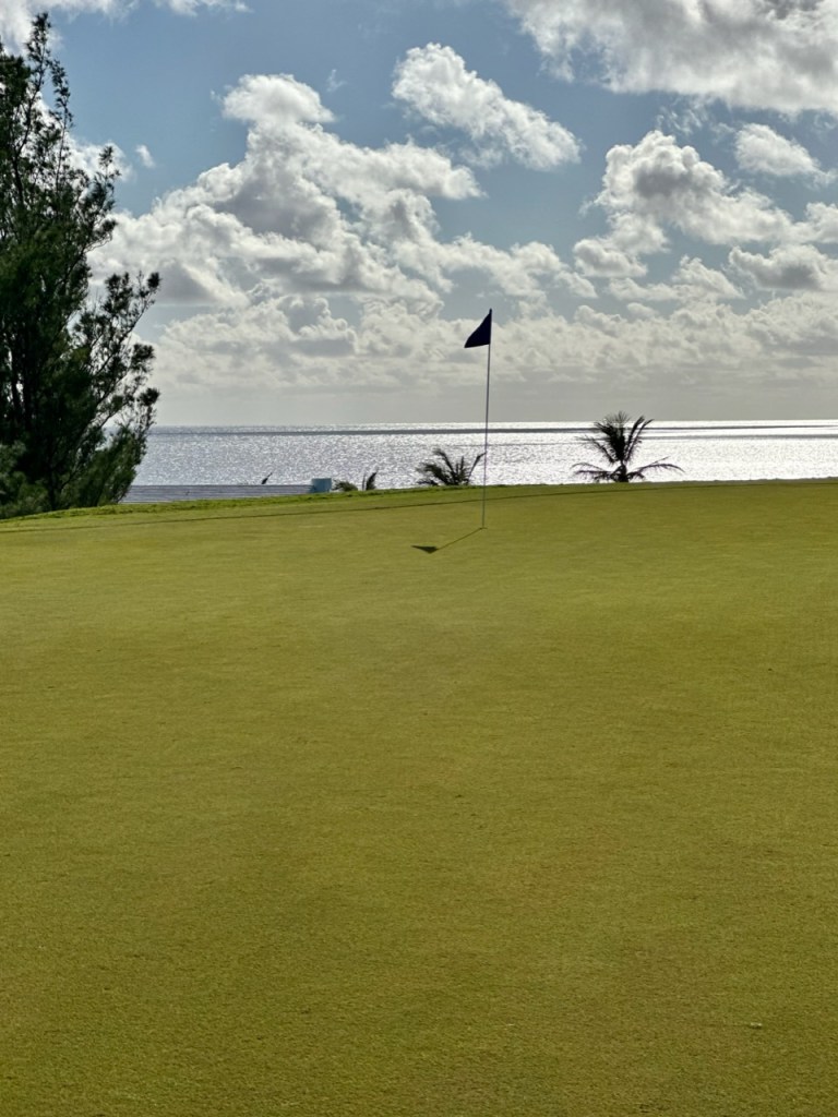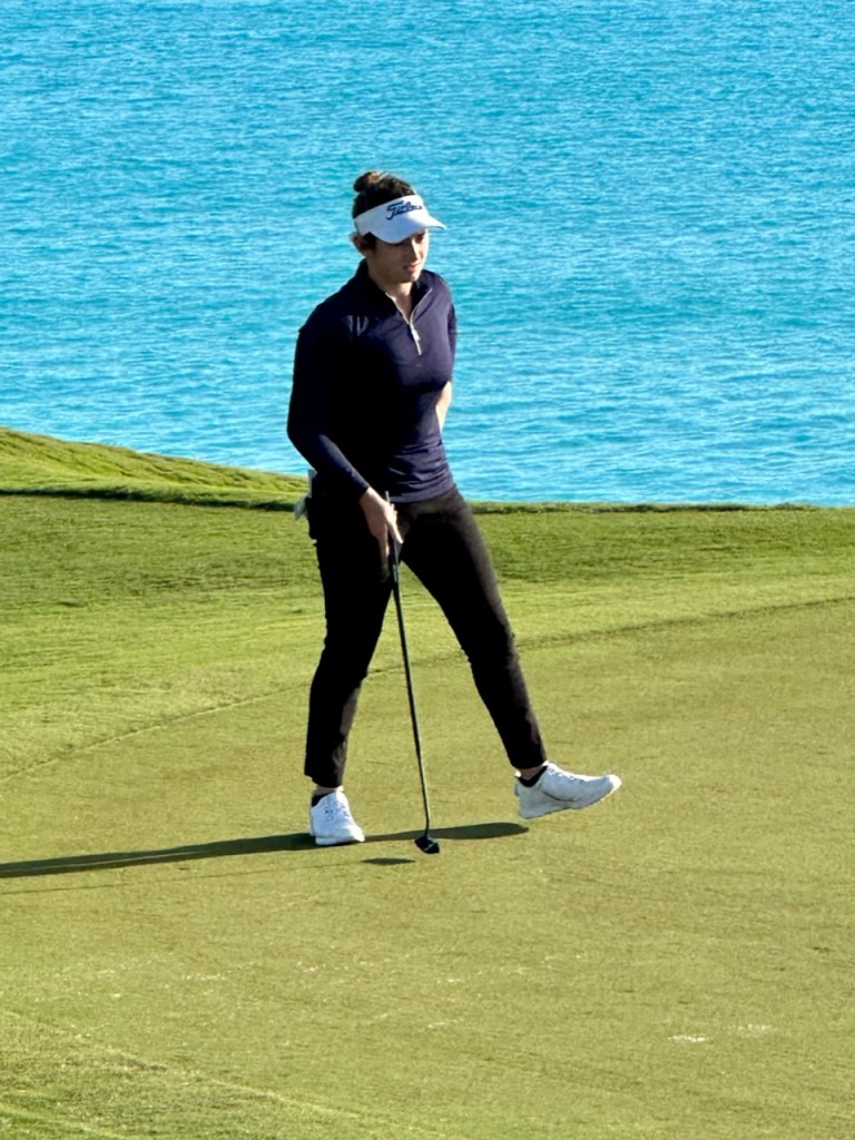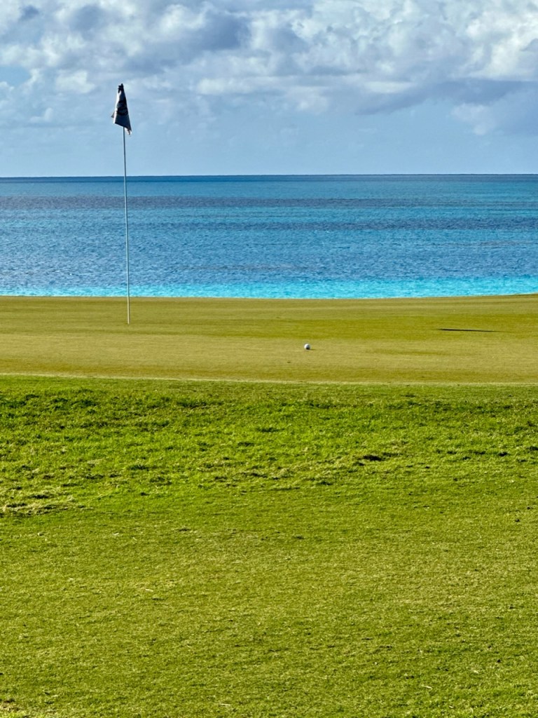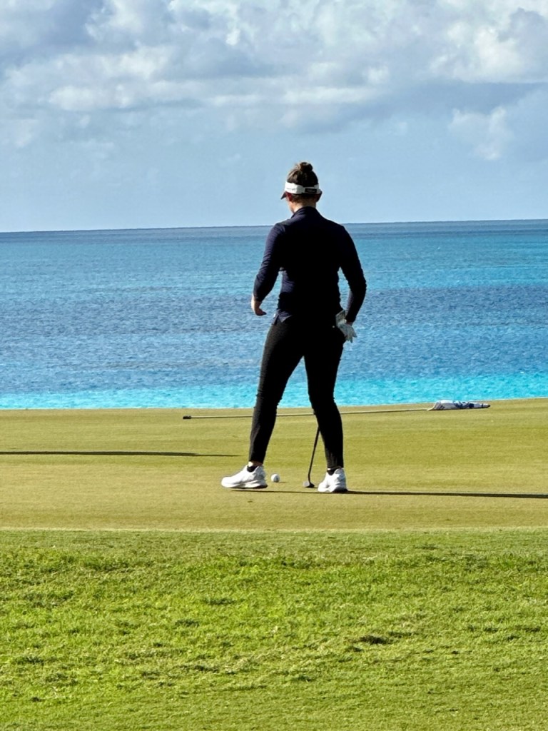 Jordan left the airport for the 50 minute drive to Port Royal Golf Club 65 minutes before her T time for the first practice round. Somehow by pulling pieces from the cases and unwrapping the clubs in motion she T’d off on time with not even a single warm up swing. She was paired up with two delightful local blokes called John and Tony (older fellows, not part of the tournament). These guys were great and had 3 qualities that were very much appreciated; Local knowledge of the course (John lives two minutes away and Tony 3…I might have got that backwards), they played very fast, and most importantly they could give great restaurant recommendations and those spots that should be avoided. They had fun playing with Jordan and asked to follow her. If you guys are reading this, welcome. B played quite well with the exception of the first time she fell into a Bermuda sand trap and had to learn how to get out. She shot about even with 3🐥’s and loves the course. The views are beyond sensational. Lots of photos to posts but may take a few separate posts with limited WiFi bandwidth.