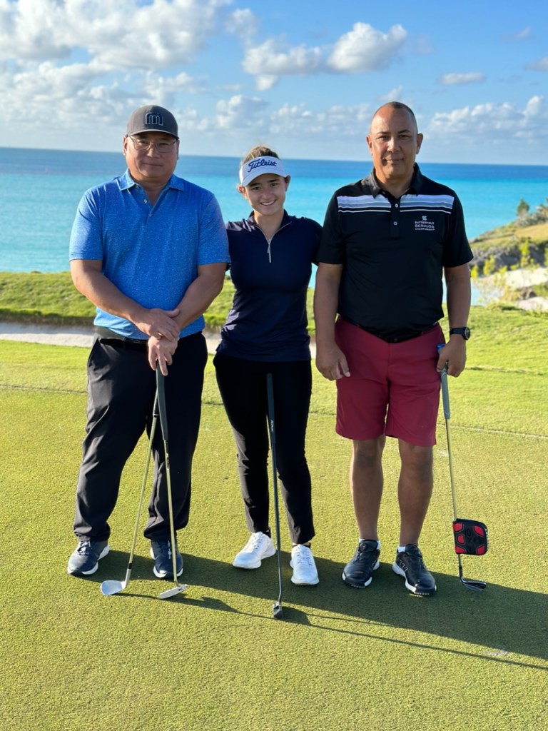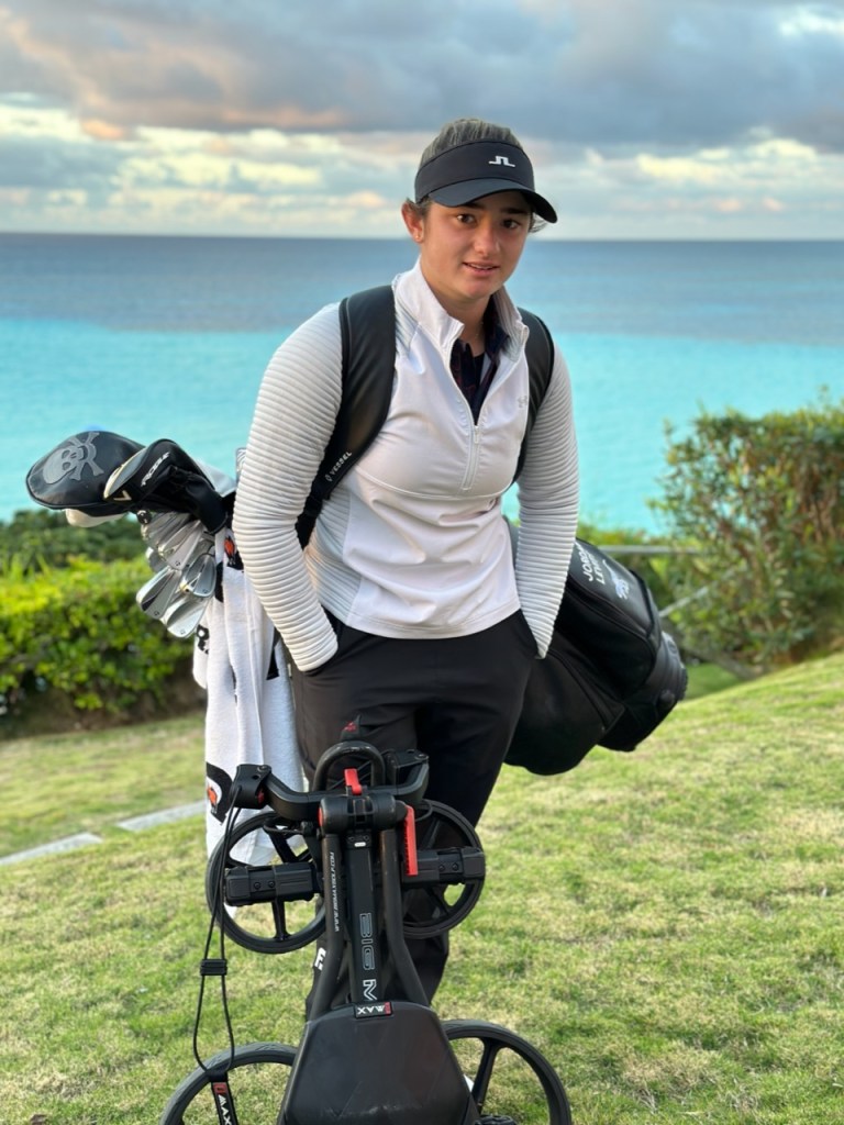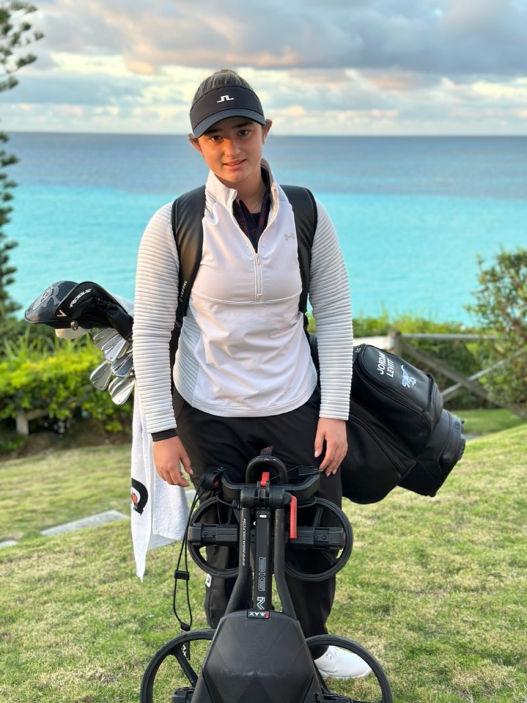 Today is the official practice round and Jordan has coach Carl watching and following her. Tomorrow’s T time is 9am and it will be a shotgun start. B is T’ing from 11. Weather in Bermuda is calling for sustained winds of 22-40 MPH with gusts to 60+ in driving rain and possible thunder. The tournament would have to suspend play in those conditions and the rumors are flying that they may play 36 holes on Sunday, and the final 18 on Monday. This is very hilly course if that actually does come to pass Jordan’s 4 day a week strength, cardio, and fitness routine and 7 days a week of 4 hours a day playing golf should serve her well. Carl and dad may not fair quite as well. But according to the owner of the hotel where the players are staying who she met at breakfast, “This is a very small island. Storms often miss us.” Stand by on that one.