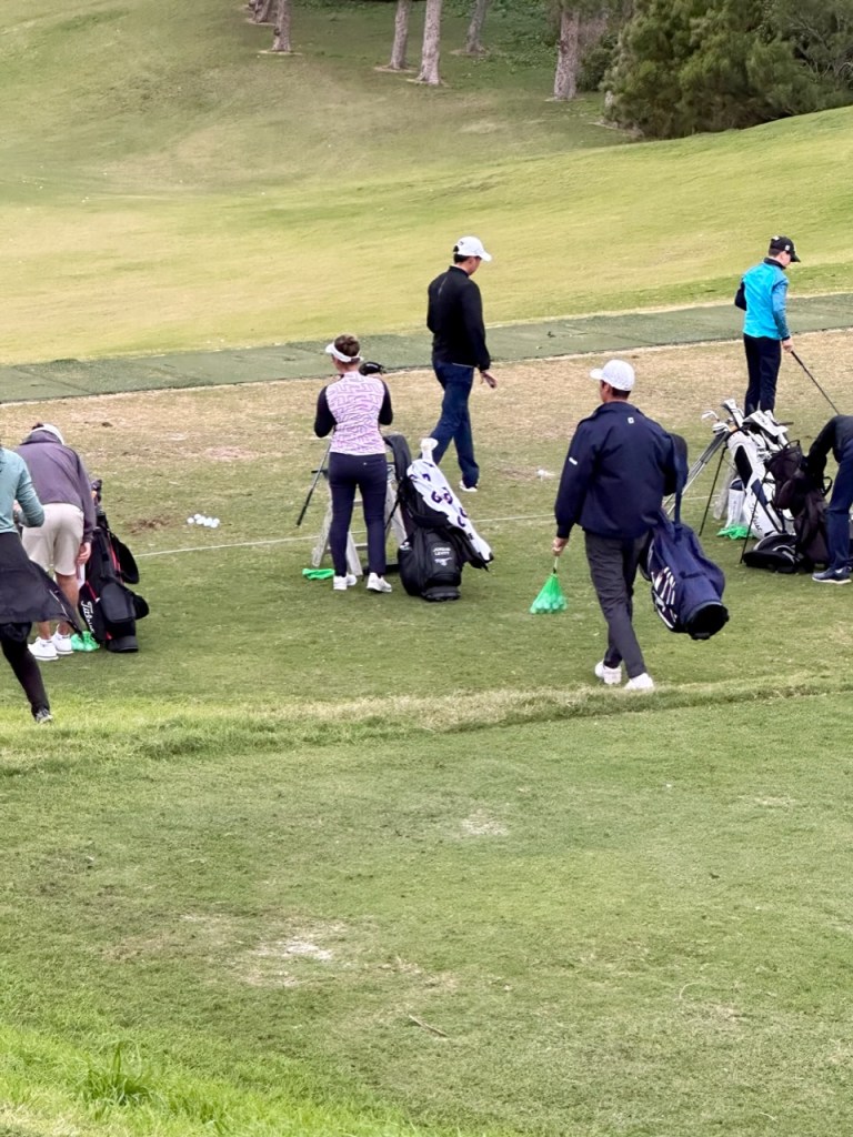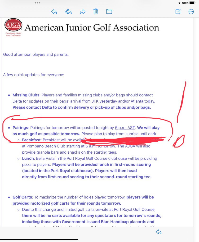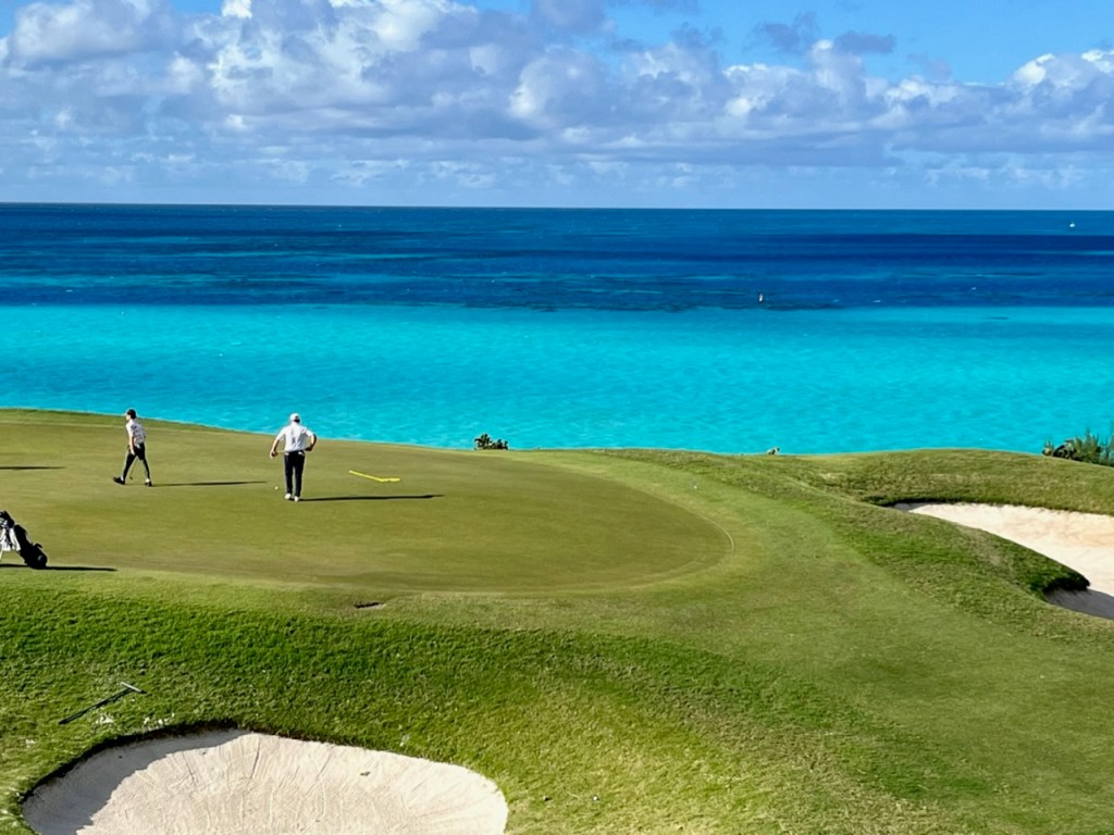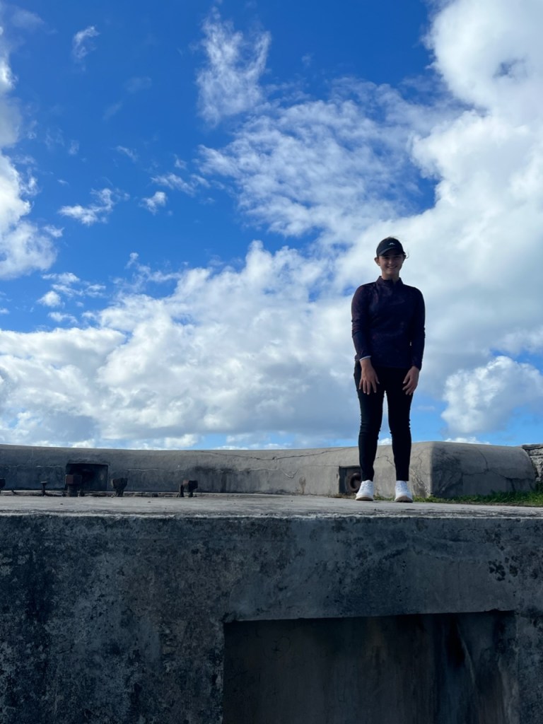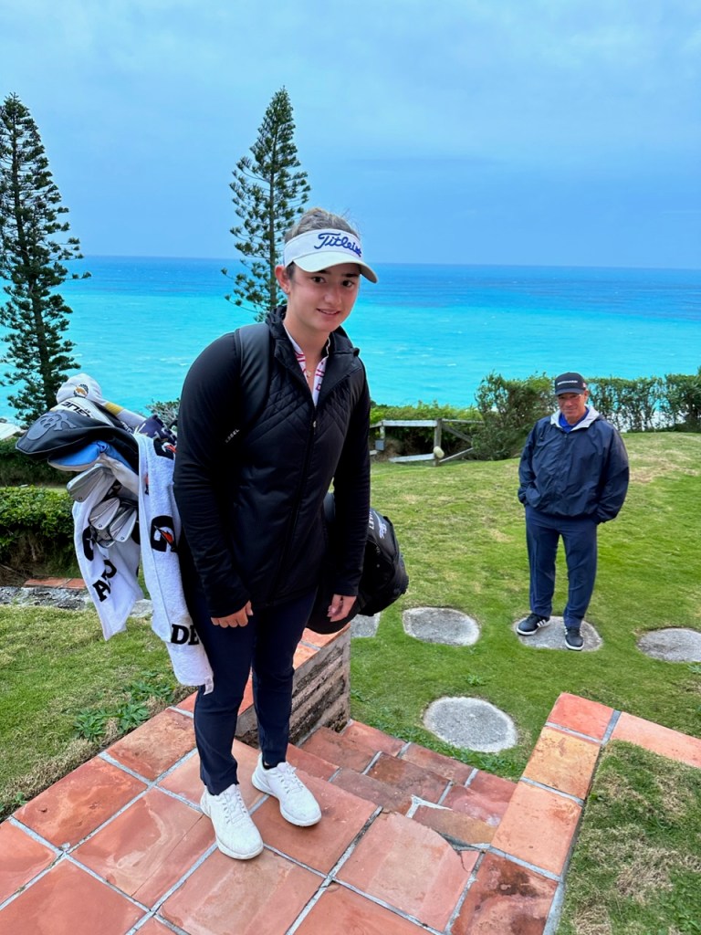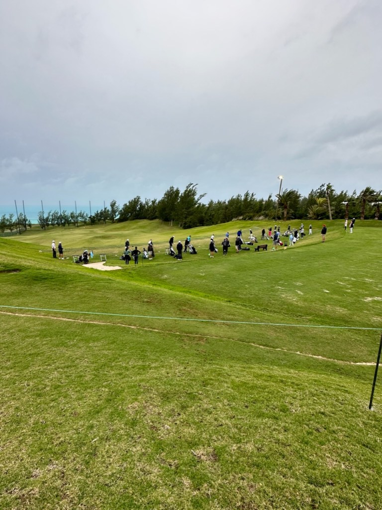 As of right now the weather in Bermuda is properly dark and stormy. Wind is blowing at a constant 51mph gusting to almost 70. Rain is driving sideways, furniture on the deck is banging against the walls, and the lights are flickering. B is warm and cozy after a hot shower with headsets on working away at her homework. She, Coach Carl and dad just came back from Hamilton where they had lunch. Definitely time for some rest for tomorrow is going to be a tough day. The AJGA just announced that they would provide pairings for the players at 6pm, and “Plan to play from Sunrise until Dark.” Certainly going to be hectic but this is what all of the training is about.