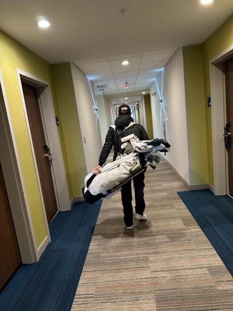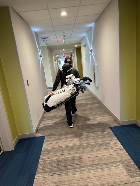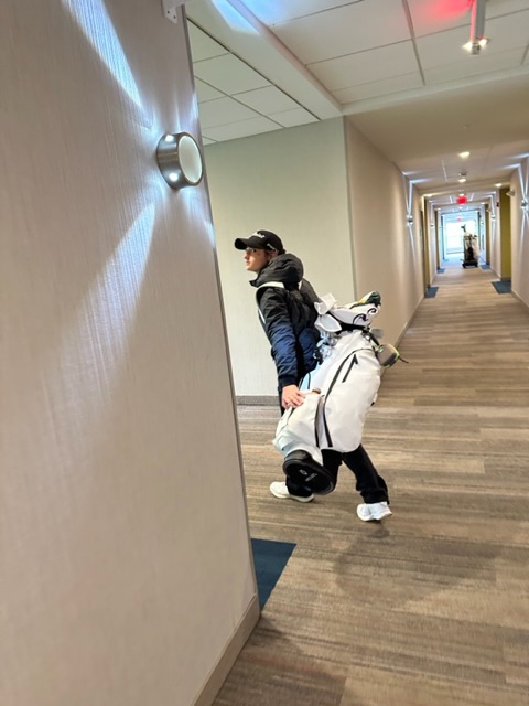 Most of the round today was in the pouring rain and tomorrow looks to be at least as bad. SuperMom is a trooper and a great sport. She picked up a small feast at Olive Garden (the only restaurant in town where they could find gluten free food) and they watched tv and had a picnic in their hotel room as they attempted to dry out the gear for tomorrow morning where they will begin bright and early. Jordan’s T time is at 8:48 from #1. This means that they will leave their hotel by 7:15 at the latest.