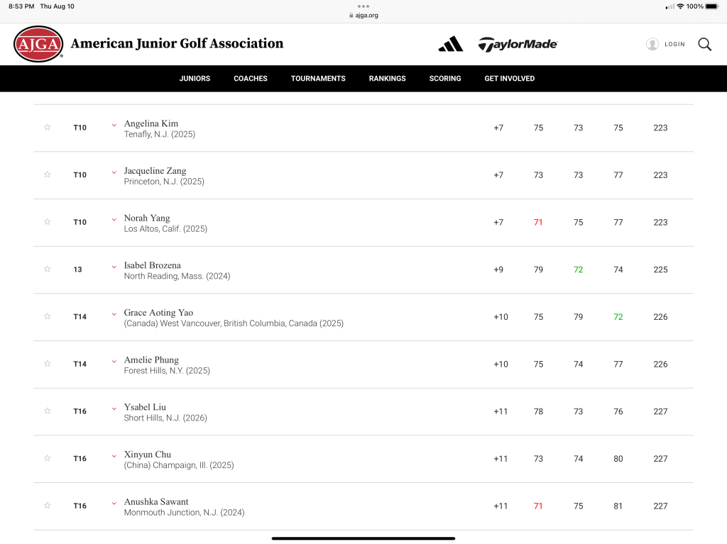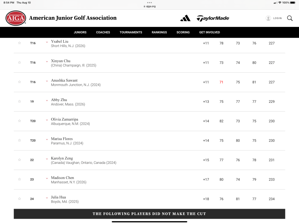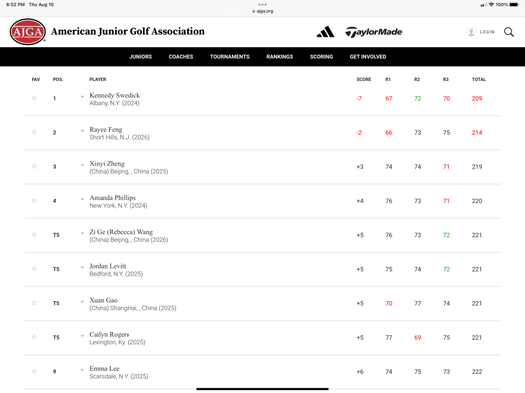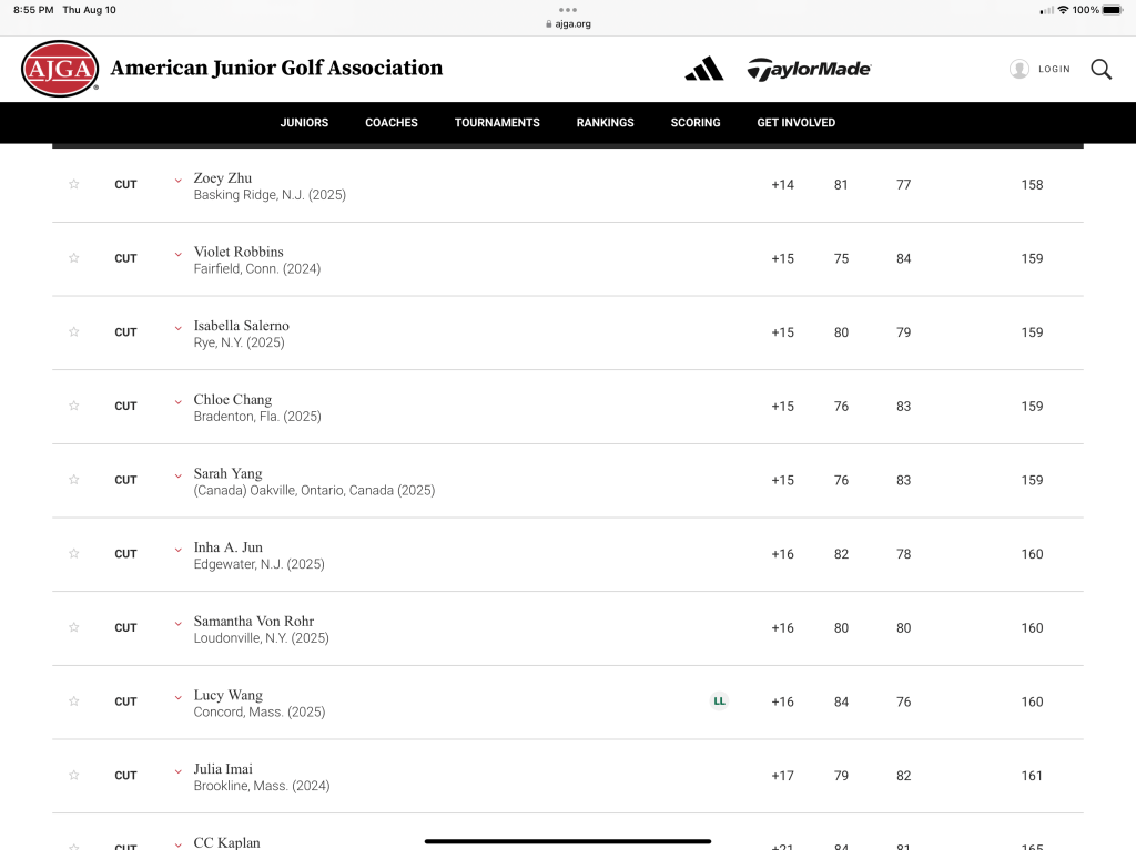 That’s all for now. Jordan will be off from tournament golf until she returns on August 22nd for the AJGA UHY Albany Junior at Normanside Country Club. Coach Carl will come to NY next week for two days of intensive work to get B turned up for this last tournament of the summer 2023 tour. A big thank you to everyone who supports Jordan and again, a special shout out to Jerry who was again walking with SuperMom today taking careful notes, writing the play by play, and strategizing with Coach Carl.