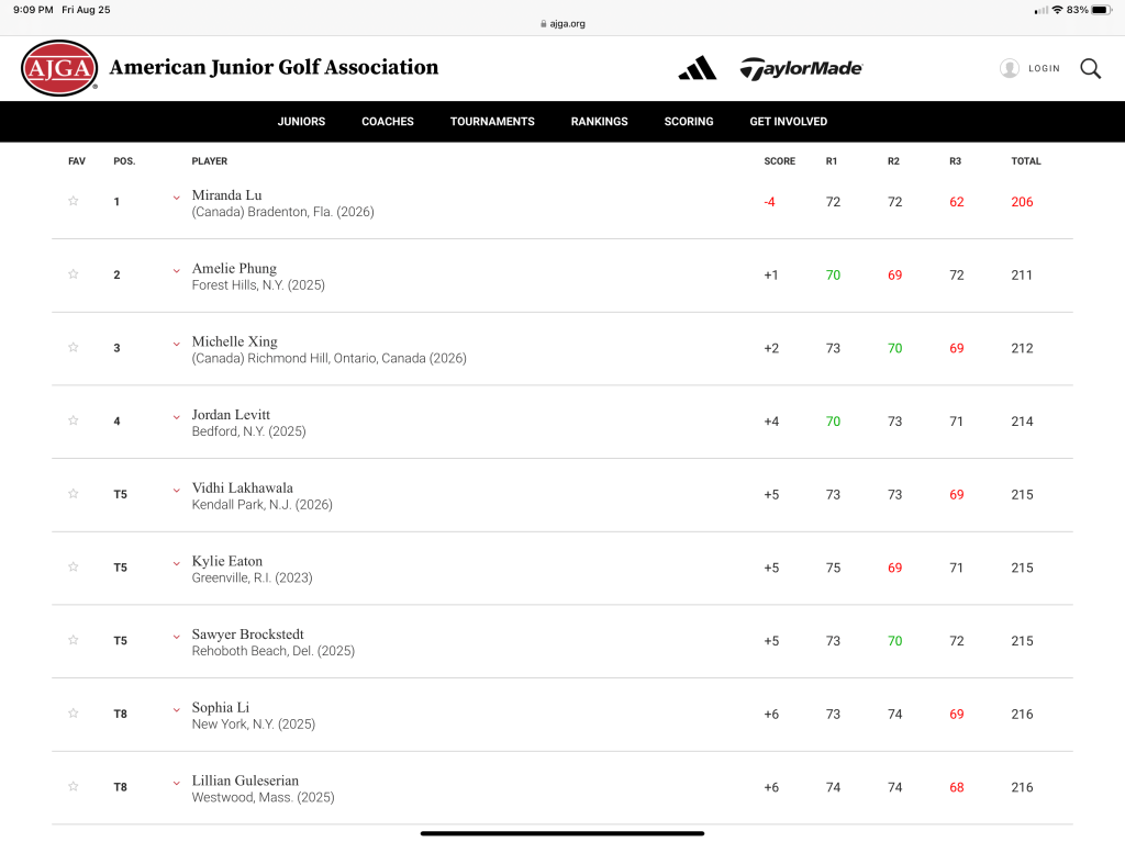 No lowlights to talk about. Jordan has proven that she can hold her own with some of the best other juniors on the planet. Though Jordan did not win, she bested a number of very talented girls who are ranked much much higher than she is. This has been a truly extraordinary run for a second AJGA top 5 finish.