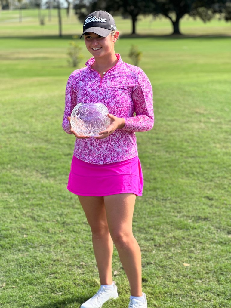 It was not a gimme by any means. Girls came out to play and four of them were tied going into today’s final round. In the end, Jordan prevailed thanks to her driver and her short game which covered up some not so great play along the way. Jordan came out swinging this morning once again carding 3 🐥’s in her first 5 holes to go to -3. In the end, she would finish regulation play at +1 tied with a very talented Sophia Hong. They would go on to play 6 playoff holes before Jordan could claim the title. She shot 73/73 over the 36 hole event.