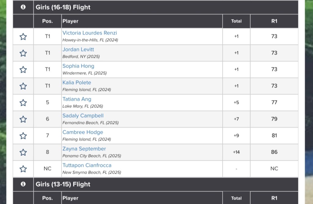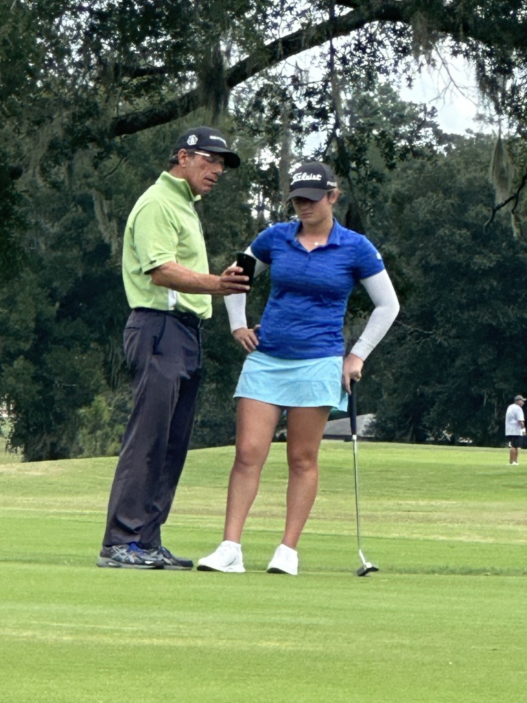 FSGA tournaments get pretty granular with age groups so though there are 32 girls overall, only 9 are in the 16-18 year old age group which means that almost half of the field is tied at this point. Coach Carl felt that she did a great job considering her time away from tournament golf and that she left 7 legitimate strokes on the pitch. This tournament is a warm up for The Peggy Kirk Bell National Championship Invitational that B will play in North Carolina 3 weeks from now.