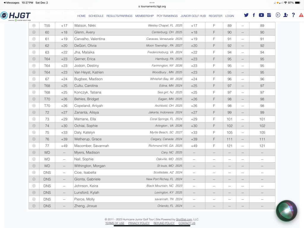 Today Jordan will play with the final group and fight for the Championship. She came out yesterday and showed just how far her game has come in three short years. This tournament was the reason that she came to Florida in 2020 after earning a spot with her second place finish at a Hurricane NY Jr. Open where there were 4 contestants in the 13 and under division and she shot in the high 80’s. The day after Thanksgiving she took the Auto-train down to Orlando and she met Coach Carl. At the time she had a handicap of 11 and after two days with the new coach it was determined that she would not play the tournament. Now, her handicap is +4.8 (for those who don’t know and that includes most golfers, a plus means you are better then scratch which is a zero handicap) and she has earned her right to play in the final grouping.