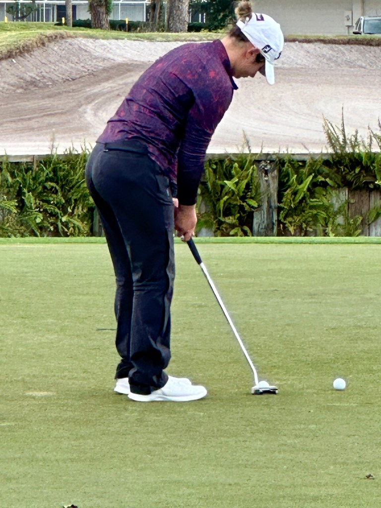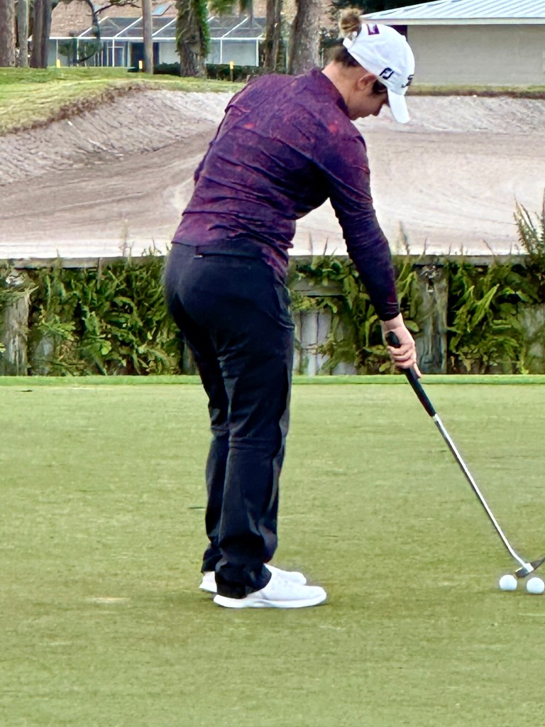 She is annoyed at the missed birds for sure witnessed by the fact that she is putting right now as this is being written in the rain after the round. She is determined and one of the few it seems as SM says there is no other player on the putt.