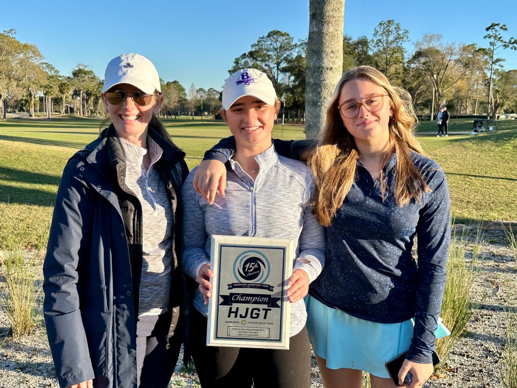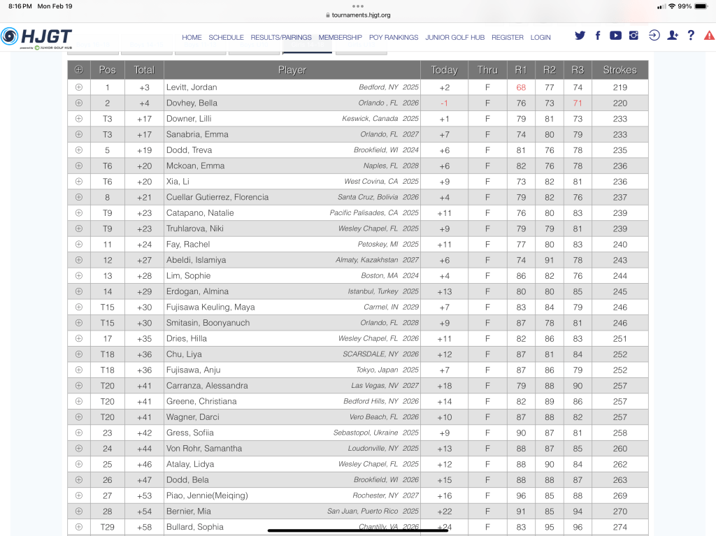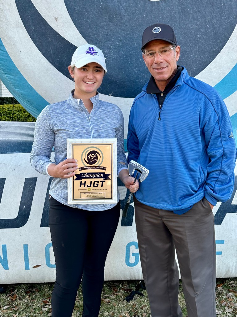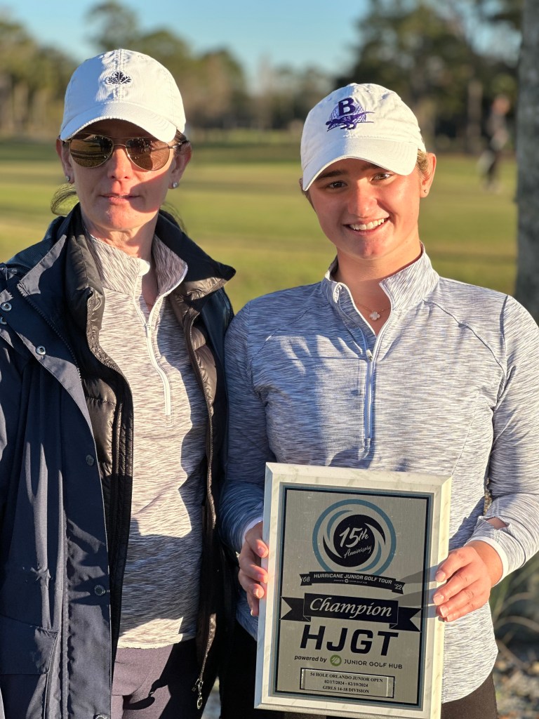In the end, Jordan won by a single stroke. As everyone who was following knows, it was a nail biter. Jordan’s kept it together playing a consistent game carding 2 bogeys and 16 pars with only a single 3 putt on 18. Bella whose family home is on this golf course took a serious run at the lead shooting -2 today. According to SuperMom, her knowledge of the course allowed her to take some extraordinary risks that paid off and almost secured her the victory. Hats off to her. She is a fierce and unflappable competitor. For class of 2026 she is the number 16 ranked player in the world. Last year after this tournament we made the comment that this was Jordan and Bella’s first battle, but it would not be the last. In the end out of the 38 girls that played only Bella was competitive. Third place was a full 14 strokes behind Jordan when all of the cards were totaled. A busload of the players this weekend were from the revered IMG Academy. This victory gains Jordan entry into the 2024 HJGT Tournament of Champions in December of this year.