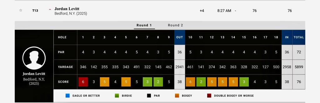 In another topsy-turvy round of golf Jordan shoots a 76 (+4) to end the day in a 4 way tie for 13th place only 2 strokes off the lead in what is a very closely packed field. 9 players are tied for the lead at +2 and another 3 are in tenth place at +3.