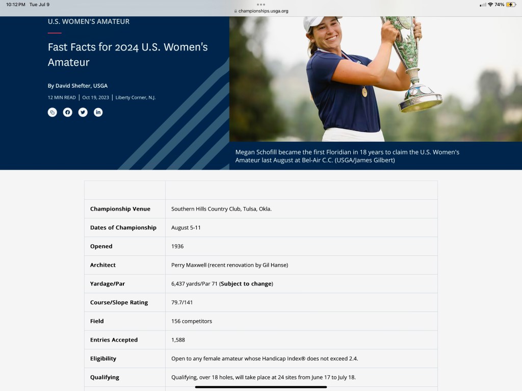 This is a “One and Done” tournament. 18 holes, 78 players fighting for 3 spots. That’s it. Top 3 go to Tulsa, everyone else goes home. As long as you are not a professional, and you have a handicap of 2.4 or better, you are eligible to enter a qualifier. No age restrictions. The majority of the field will be made up of the top College golfers from both the USA and the rest of the world plus those trying to earn their Q cards to get onto the tour. The competition level should be very high and they are playing long, 6,200 yards to be precise. Currently we can’t find any link to the live leaderboard that we are confident will exist. We will post it if we can find it in the morning before the tournament.