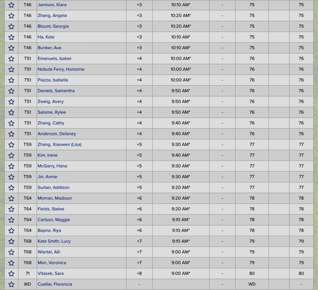 B had a bit of a rough start bogeying her second and fifth hole going to +2 after 5. At that point she was in 42nd place and a full third of the field had not even recorded a single hole yet. From her sixth hole (she stared on 10, so after 15) JORDAN shot lights out….She went -3 for the next 12, bogey free and draining 3 🐥’s. She shot a 34 for her second 9. She had a total of 31 putts, she hit every fairway in regulation and missed only two greens. She had no 3 putts. Two bogeys, thirteen pars, and three 🐥’s. Oh, and not reported in this morning’s blog, B was at Urgentcare on Saturday with an upper respiratory infection and playing this morning was touch and go according to SuperMom, NEVER even a question for Jordan of course.