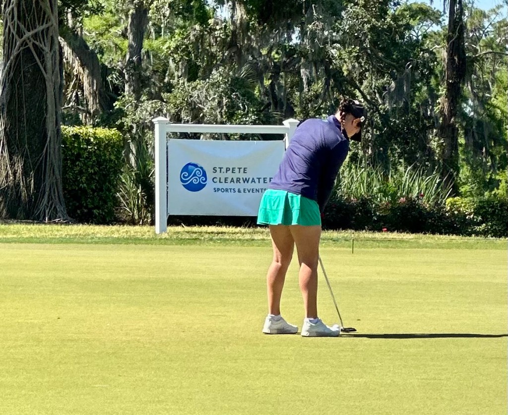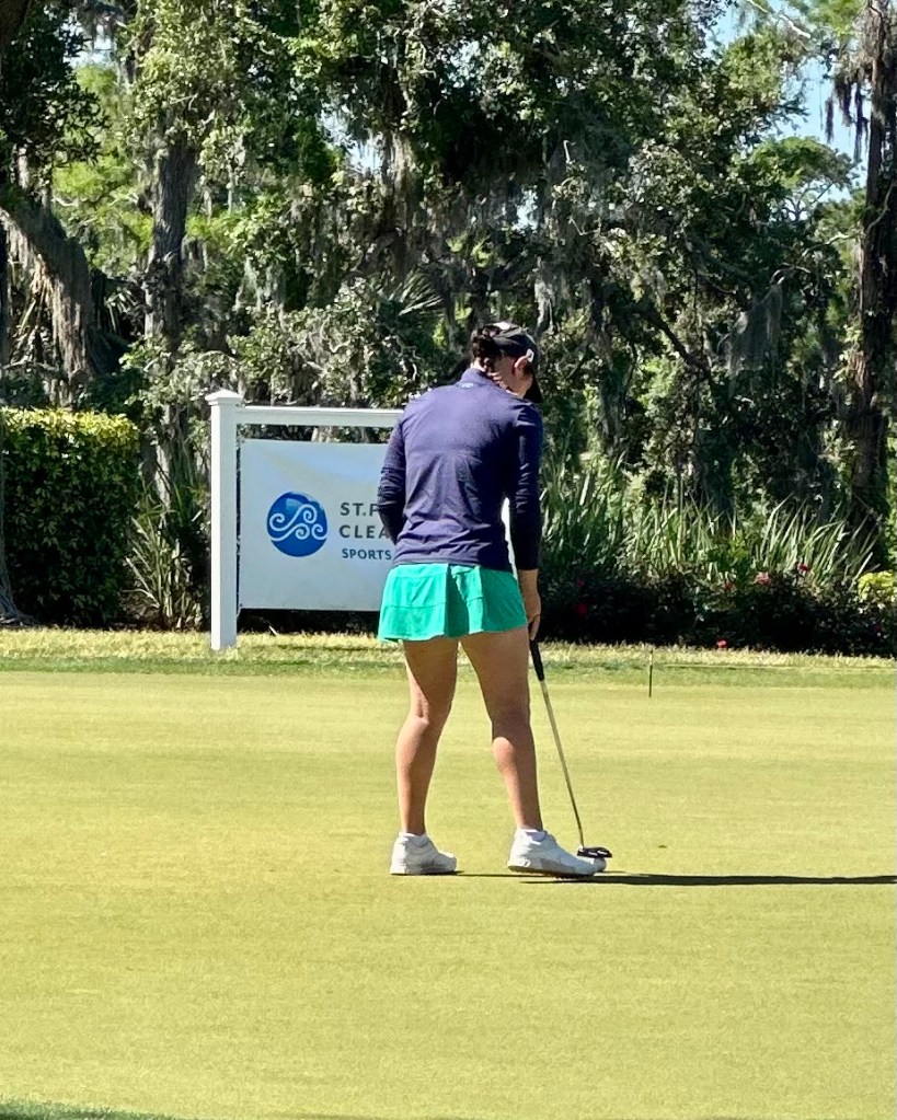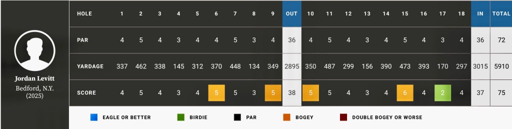 Four bogeys, thirteen pars, and one 🐥. That was the round. Highlights of the day include a “Swimming-Par” on hole two. Jordan hit her ball into the water on the second shot of number 2, a par 5 and still made par on the hole with a brilliant one putt. The other highlight of course was the single 🐥on 17, a par three that she drove to 5 feet to one putt. When dad saw her this evening after the round (SuperMom and dad switched it up this evening so dad could watch tomorrow and Sunday) and asked, “How was your round today?” the simple answer from B was, “I played ok, I just needed more birdies.” A simple answer, but nonetheless true. No big blow ups, no 3 putts, nothing weird, just not enough birdies. As Coach Carl likes to say, “The bogeys are inevitable when you are playing tournament golf, but you need to make the birdies to go low.”