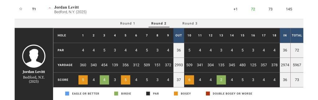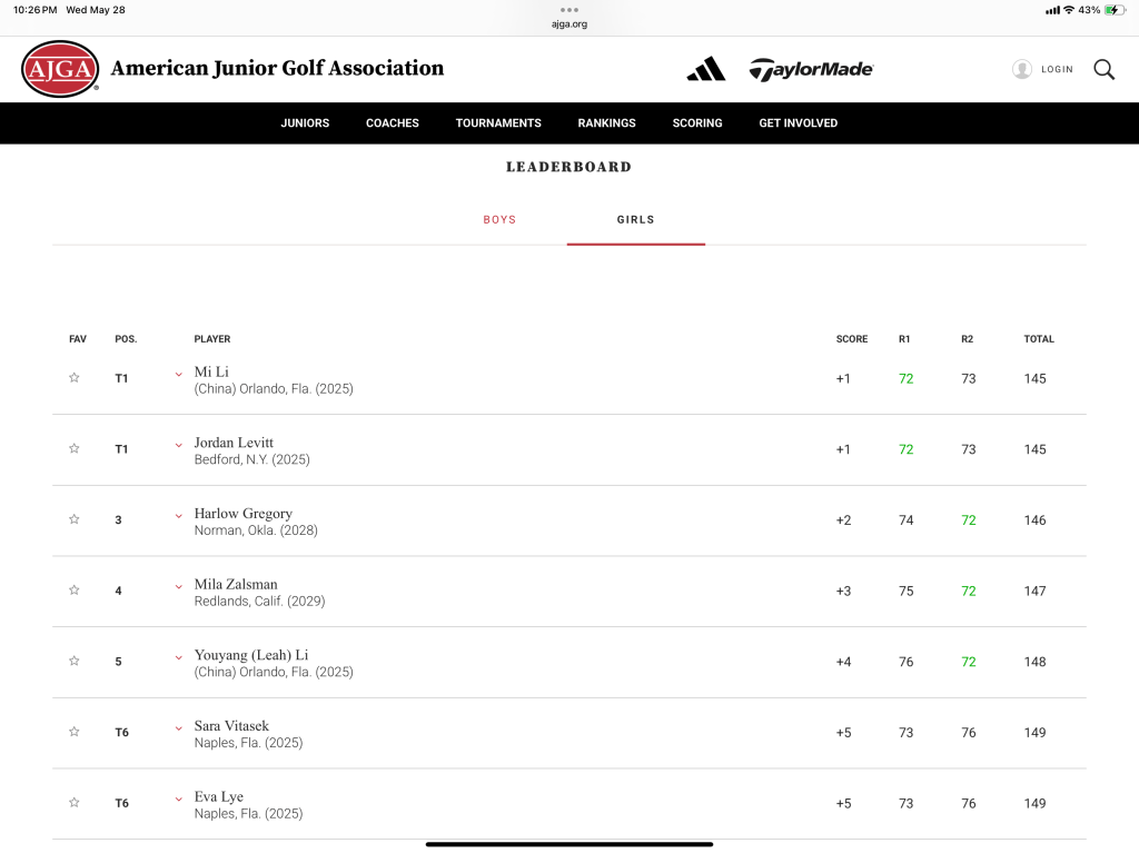 The AJGA had this one right it seems when they wrote about “Players to Watch” in this tournament. They featured Mi Li and Jordan Levitt who go into tomorrow’s final round as co-leaders of the tournament after the first 36 holes. Both of them shot even par yesterday and both of them shot +1 today. They are by no means all alone as there is a player one stroke behind at +2, another at +3, another at +4 and four additional tied at +5. That means that there are 7 players within four strokes of the leaders. Any one of these 9, a full third of the field are still in contention for Championship.