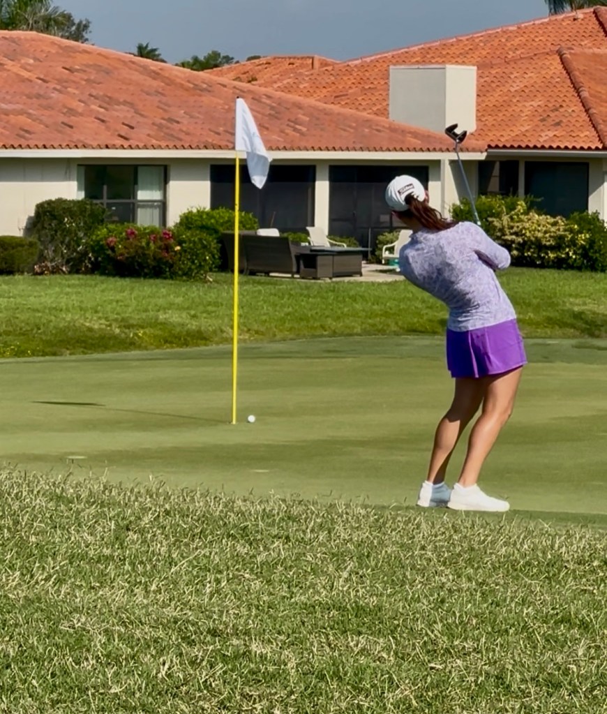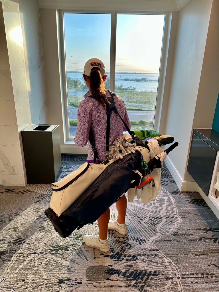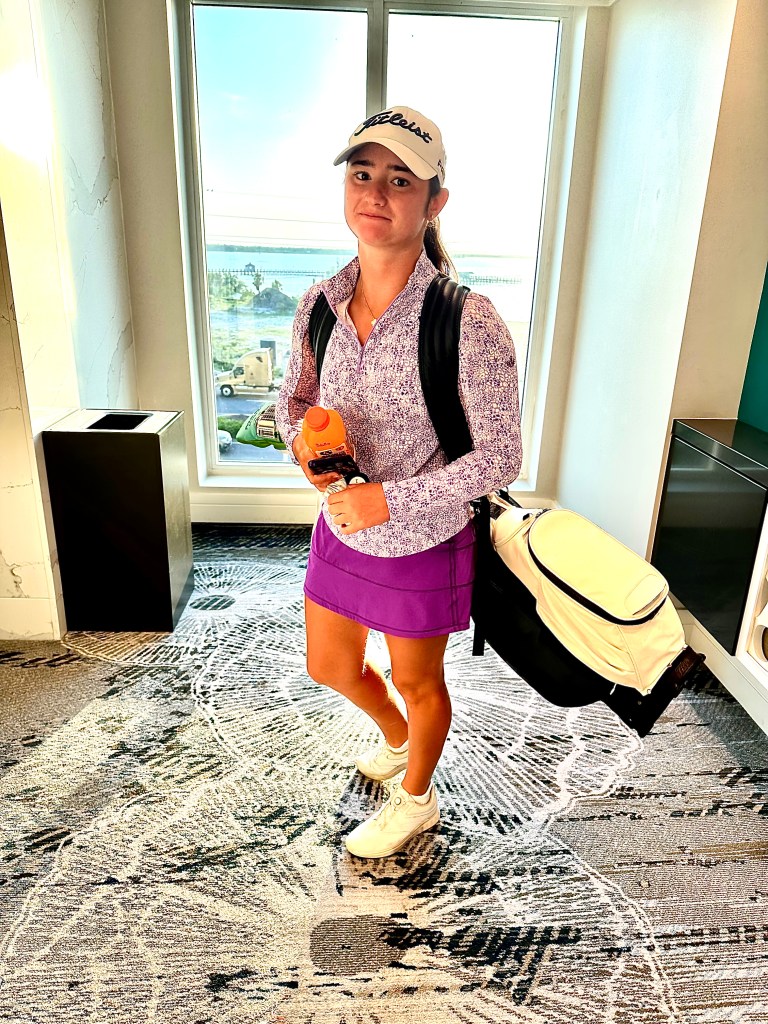 On the second 9, hole 1 was a bogey, and B’s only 3 putt on the day. It was a bit strange as the putt was from 3 feet. It hit the rim and kind of spun out. It looked like the hole choked on her ball and simply spit it out refusing to swallow it. She parred 2, and on 3, the number one handicap hole on the course (That means it is considered the hardest for those non-golfers) a par five called “Strato-Launch” she made a beautiful 10 foot putt straight uphill for 🐥. She parred 4, bogeyed 5, then went straight pars the rest of the way. Putting was significantly better then yesterday but the course simply played much harder with the pin placements. If she putted yesterday like she did today and the pins were in the same spots they were yesterday, she would have shot -5. Anyway, the result today was just fine as she remains tied for the lead with 18 still to go tomorrow. T time will at 8:50am and they will play off of 1. She will be playing alongside Mi Li, an extremely talented and accomplished player. It is going to be super exciting to watch.