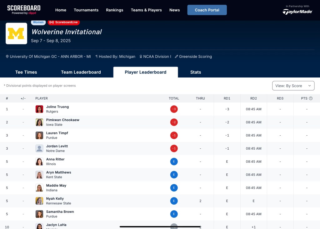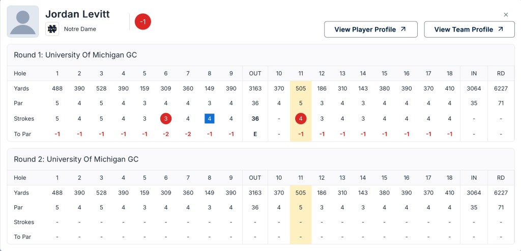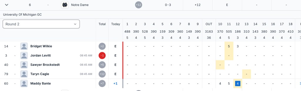 After the first round of the day Jordan is in 3rd place ahead of 78 others and only 2 strokes off the leader in Michigan. Big stage of 12 D1 powerhouse college programs and she has come out swinging for the fences. Another 18 this afternoon and another 18 tomorrow. 1 bogey, 2 🐥’s and rest all pars.