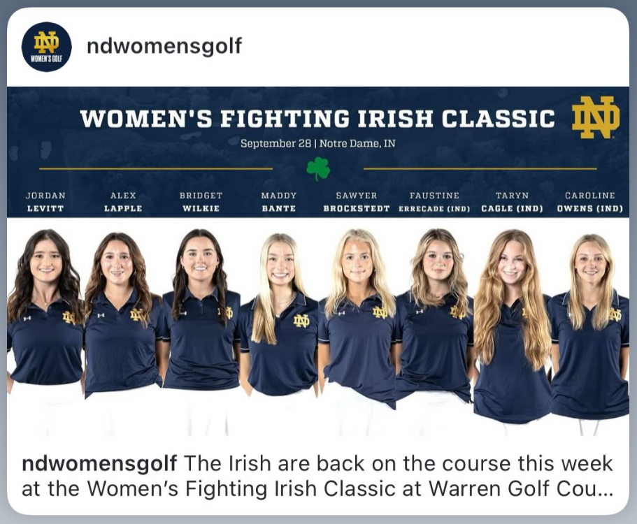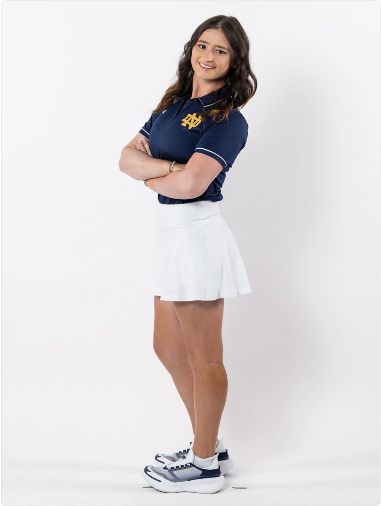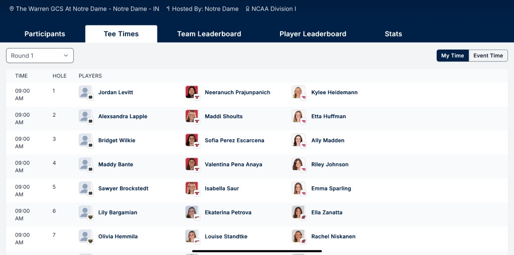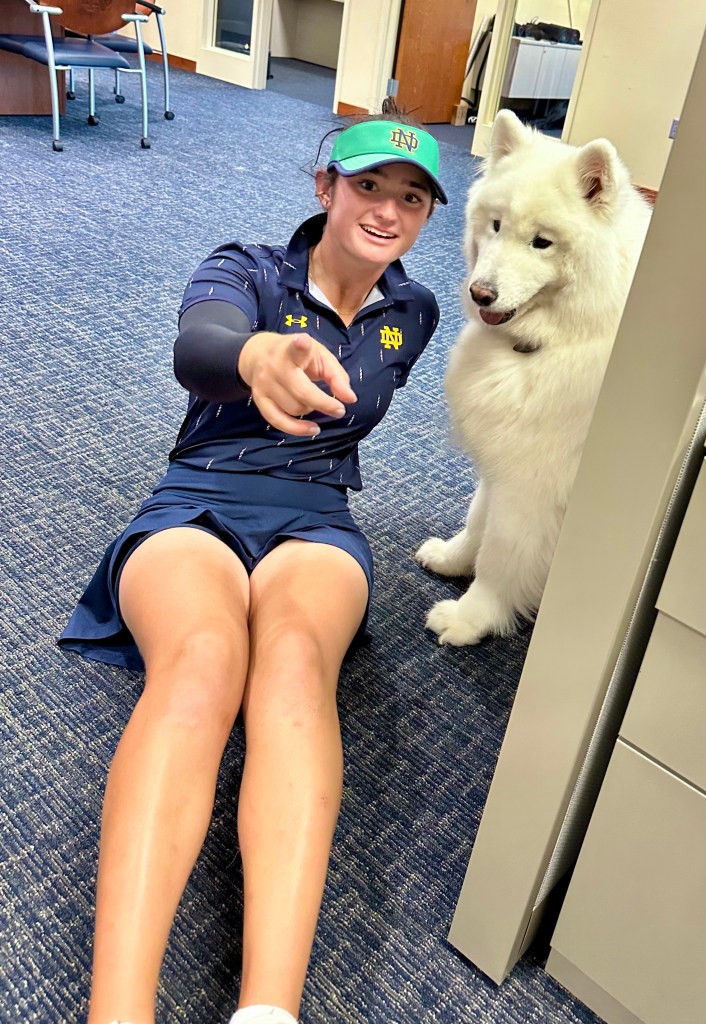 In the only event of the year being hosted by Notre Dame Jordan will take the T box of hole number one at 9am this morning for this one day 36 hole (two back to back rounds) tournament. Nine teams are in South Bend today with a total of 54 competitors. Though all 8 of the Irish get to play, there was still a qualifier to determine who would get to lead the team’s start which Jordan won. As she is the official number one seed, and Notre Dame is at home, she will officially open the tournament playing from the first T (this is being played as a shotgun so everyone starts on a different hole) making the tournament’s opening swing.
