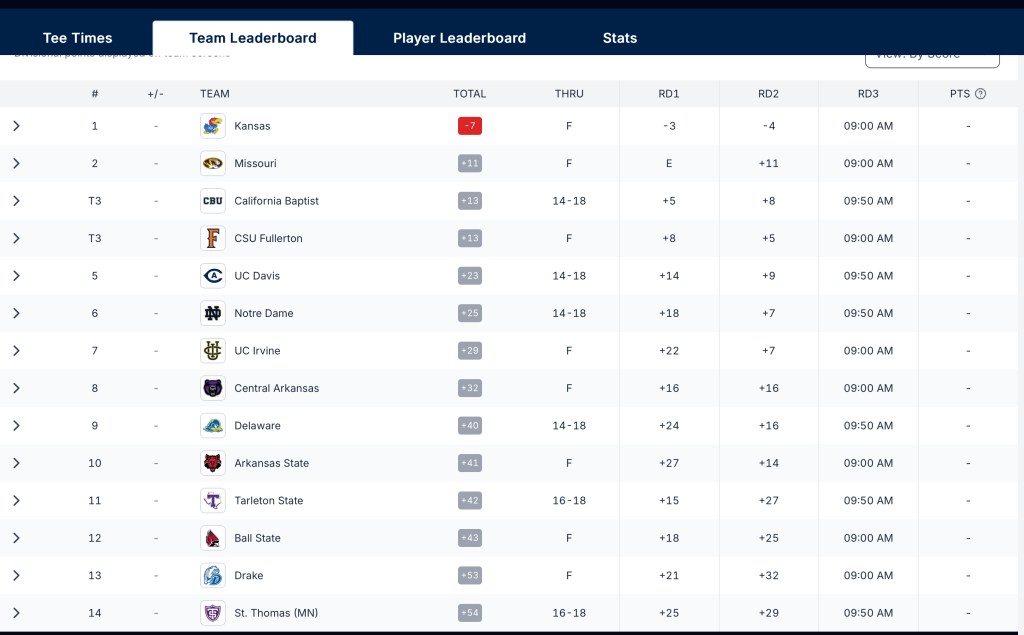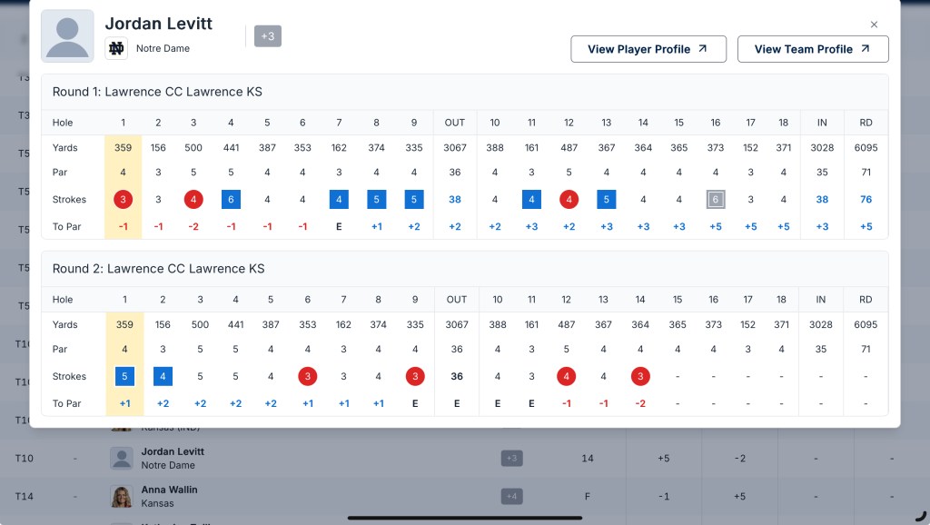 Jordan ended the first round at +5 in 39th place of the 76 players from 14 schools stretching the entire way across the country. Now she has clawed her way up the leaderboard hitting the locker room for the night in a tie for 10th place with 2 holes still to play for round 2, and an entire 18 still to go. She is just a single stroke out of 5th place, two strokes out of 3rd, and 4 out of second. She is +3 on the day and leads her team once again.