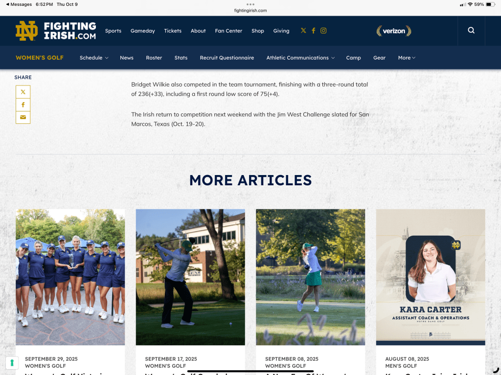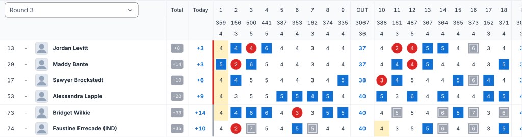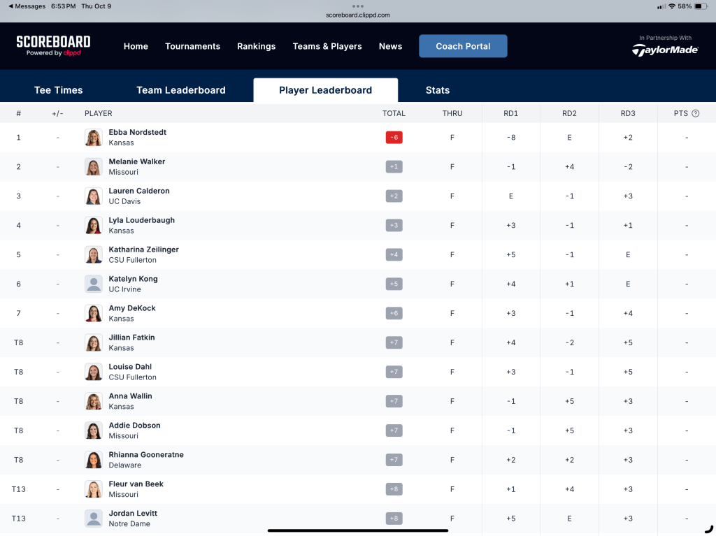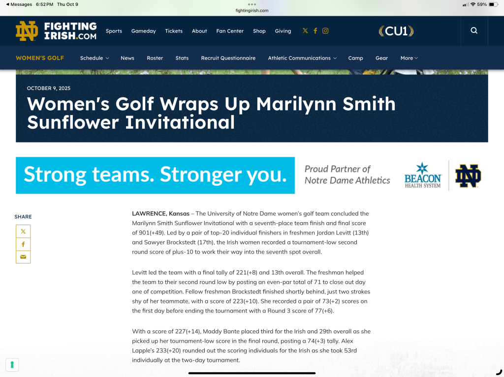 Jordan ended the tournament in 13th place besting 60 of 73 players shooting 77-72-75. Midway through the 3rd round she got as high as 3rd place on the leaderboard before she had a little trouble with the very thick rough in Kansas. Her fitness and strength training is both a blessing and a curse since arriving at Notre Dame as she is hitting the ball farther then she ever has before and so it is rolling into the rough. She will sort this out of course and emerge better for it. In the end another very strong finish in the top 15.